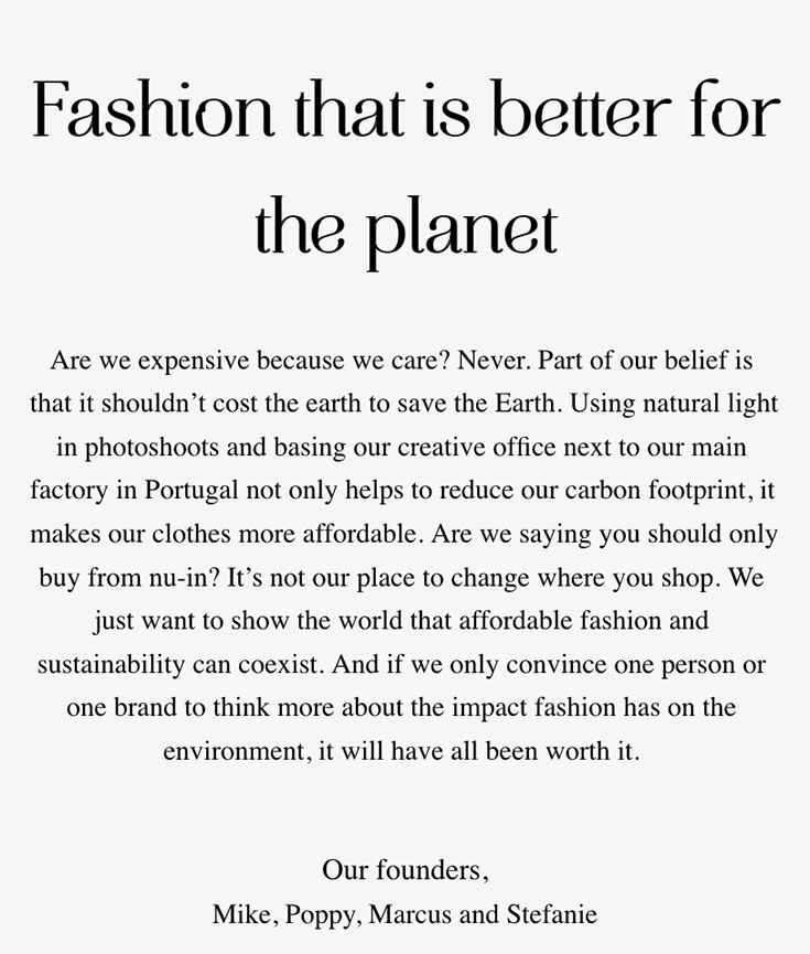 Auf der Website von NU-IN steht: »We’ve designed every part of our business around sustainability to show the fashion industry that it can be done…« Jeder Teil des Unternehmens wurde auf Nachhaltigkeit ausgerichtet? Wirklich? Und warum wurde der Claim dann geändert?