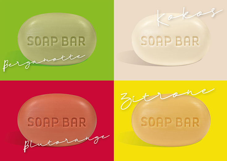 Basis der vier Seifen in den Duftrichtungen Kokos, Zitrone, Blutorange und Bergamotte sind biologisches Kokos- und Olivenöl sowie »Roundtable on Sustainable Palm Oil«, kurz RSPO, zertifiziertes Palmöl aus nachhaltigem Anbau. Alle vier Seifen enthalten rein natürliche, ätherische Öle und biologische Weizenproteine, die helfen, unsere Mähne leichter kämmbar zu machen.