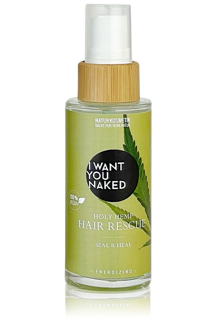 Um dem Feuchtigkeitsverlust vorzubeugen, konserviert das Holy Hemp Hair Rescure Seal & Heal von I Want You Naked die Feuchtigkeit in der Haarfaser mit Argan- und Klettenwurzelöl. Das Haar sieht sofort glänzender und gesünder aus. Über ecco-verde.de*, 50 ml, UVP 20,30 Euro, *vegan