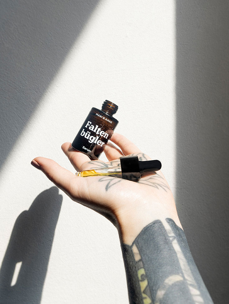 Nach zwei Wochen Nulltherapie sollten die Symptome langsam abklingen, bis die periorale Dermatitis aber vollständig verschwunden ist, dauert es gern mal mehrere Wochen. Fenjas Haut brauchte sogar Monate bis sich ihre Haut erholt hat. Hier ist Geduld gefragt. Wenn die Haut zu sehr spannt, wirken auch Schwarztee-Kompressen beruhigend. Dann kann man sich langsam wieder an Kosmetikprodukte heranwagen, bestenfalls aber an Cremes & Co. mit möglichst wenigen und milden Inhaltsstoffen. Fenja hat sehr gute Erfahrungen mit der Pflege von Mari & Anne gemacht. Sabine, Mitgründerin und Tochter des Familienunternehmens, litt ebenfalls unter perioraler Dermatitis und weiß genau, was der Haut jetzt guttut. Beispiel: Das Faltenbügler Serum mit fünf glättenden und feuchtigkeitsspendenden Inhaltsstoffen oder Sensibelchen, eine Gesicht- und Körperseife für sensible und empfindliche Haut, die durch Kokosnussöl einen sanften Schutzfilm hinterläßt. Keep it minimal! Fenja schwärmt auch von der Ringelblumensalbe Sensitiv, die für weiche und frische Haut sorgt, nachdem sich diese monatelang angefühlt hat, wie »eine ausgetrocknete Rosine«. Die Produkte von Mari & Anne kommen ganz ohne Schnick Schnack aus, sind tierversuchsfrei, nachhaltig und werden in Deutschland handgefertigt.
